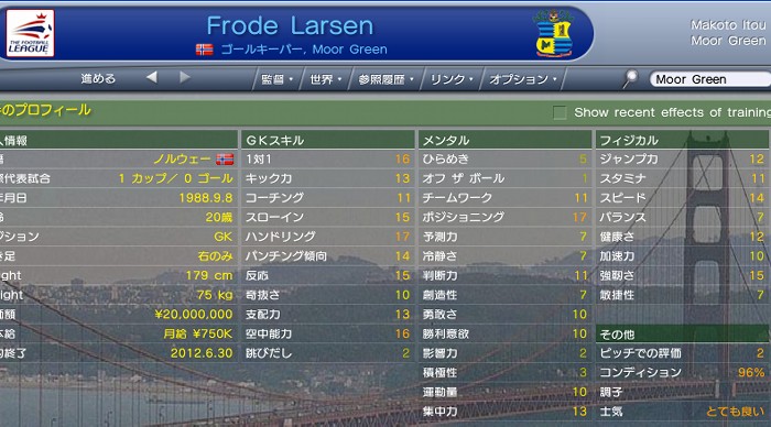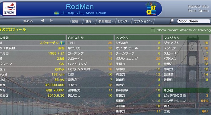 え〜と・・・(-"-;) 他の国をプレイしようと思って世界各地を回ってきました。 韓国、香港、中国、インド・・・そしてアメリカ・・・ どこもさわりだけちょこっとプレイして、しっくりこなくて、アメリカはバグの強制終了が怖いので。 そのあと、スペイン、イタリア、ドイツと周り、最終的にたどり着いたのが、イングランドでした。 プレミアシップでやろうと思って、現実で最下位ばく進中のサンダーランドをやろうと思ったのですが・・・・ う〜む、 結局、このチームのことが忘れられなくて戻ってきてしまいました。 過去4年間の延長ではなくて、 新規作成したゲームというつもりで! イングランド、コカ・コーラ リーグ2の降格候補クラブ、MoorGreenを始めたいとおもいま〜す!! 6/1 復帰