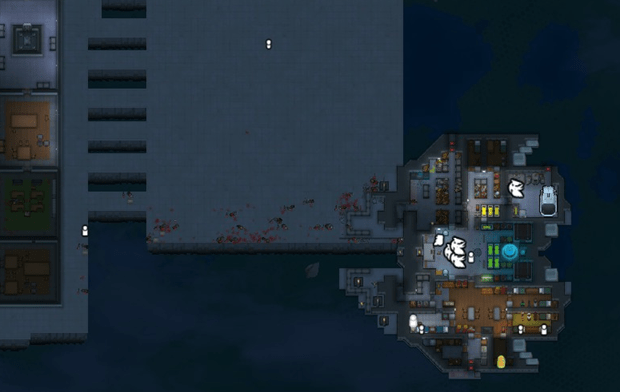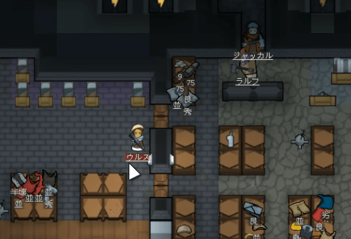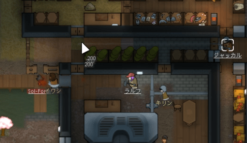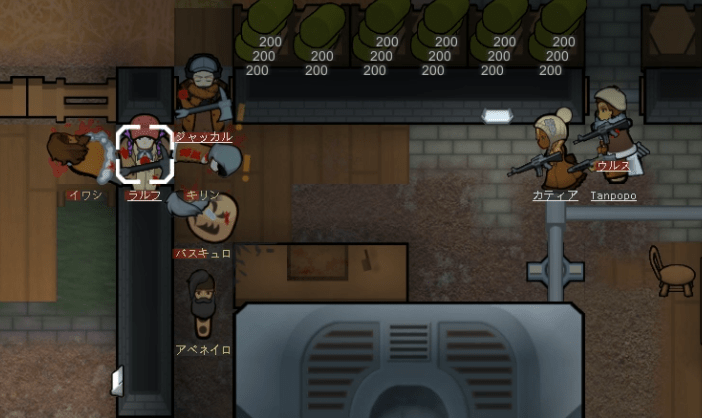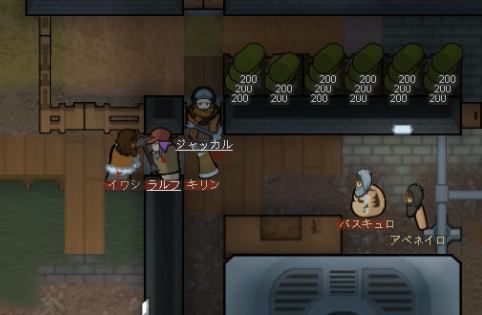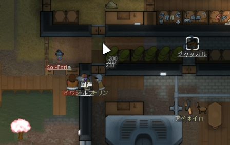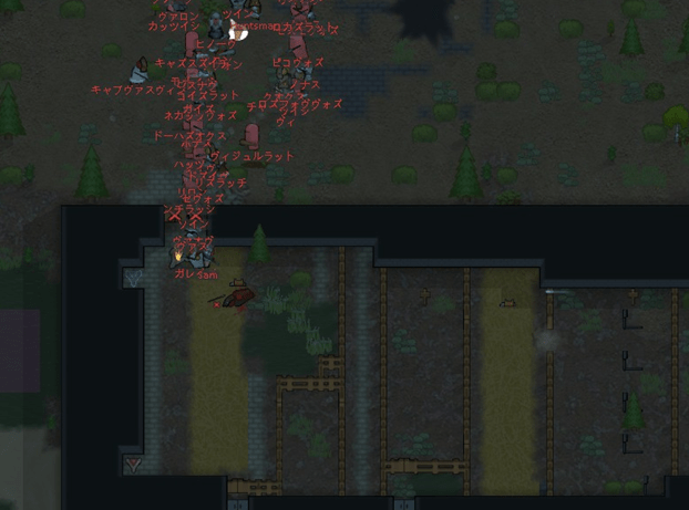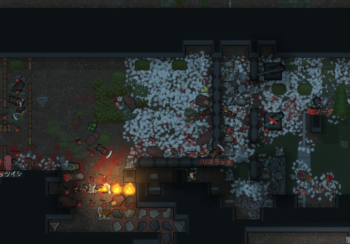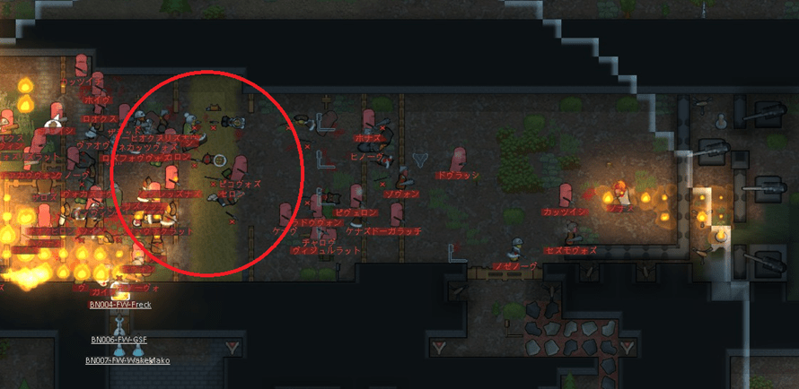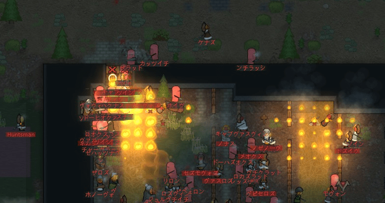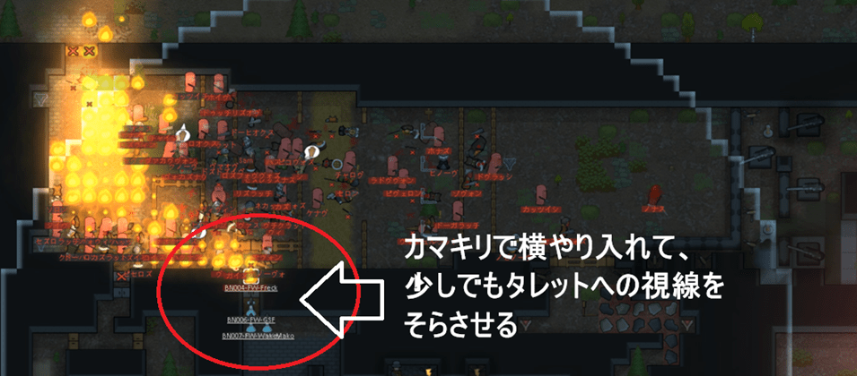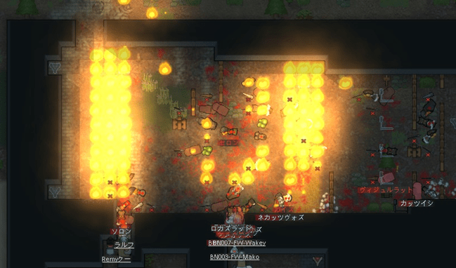 足の速い数人が、ウランスラグで瞬殺。あとから殺到してきた集団にハンタードローンが炸裂して最初の足止め。そして燃焼トラップに誘爆し、藁の床が燃え上がります。