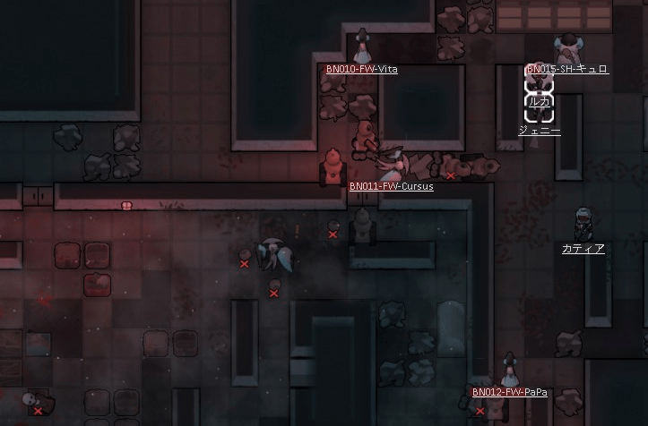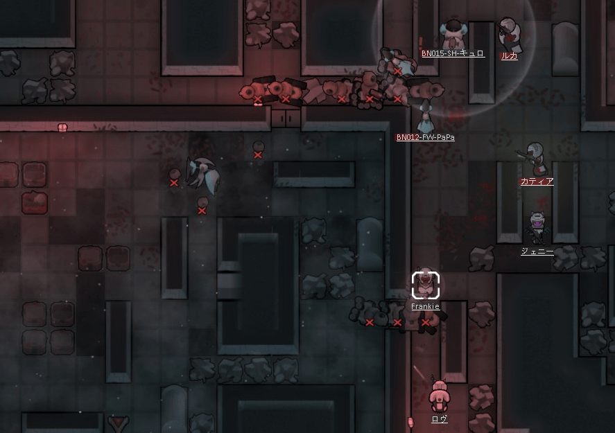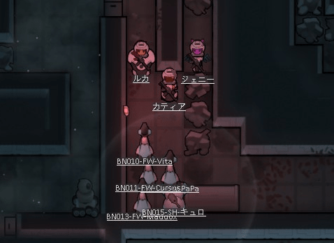 ハンタードローンの対処がしやすいようにと、見通しの良さげなところに陣取って大部屋に入ろうとしたら、次から次へと7体が襲ってきました。