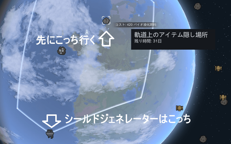 ここで補給して心情整えたら、アイテム隠し場所衛星に打ち上げという方向でいきます。