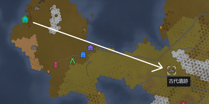 で、ここは1回で到達できるんですが、鉄と食糧の調達もかねて、まずは地上のこの遺跡に向かおうと思います。