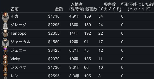 メカノイドキル数は、意外な人員が上位に食い込んでいました。